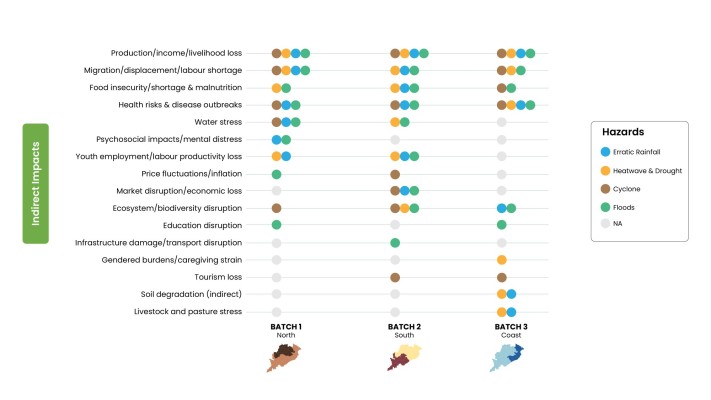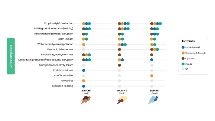 Crop loss was the most widely reported direct impact, cutting across all hazard types and the three batches. Hazards such as cyclones, erratic rainfall, and floods were linked to soil erosion, infrastructure damage, transport disruption, and livestock loss. At the same time, heatwaves with extended periods of drought were reported to cause water scarcity and a decline in livestock, fisheries, and crop productivity.