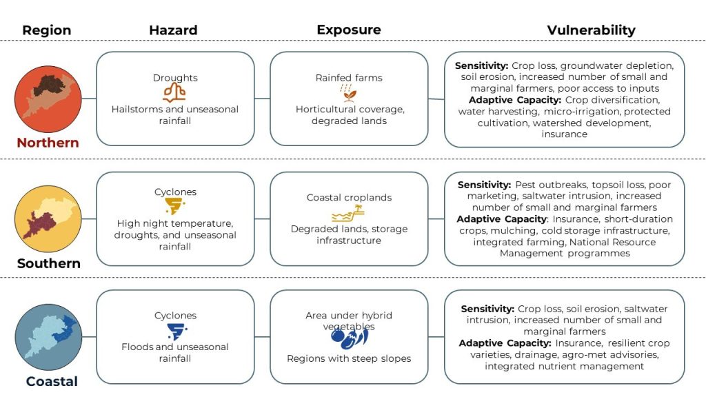 These regional perceptions translated into distinct indicator preferences: northern teams prioritised rainfall variability and groundwater depletion, while southern and coastal groups focused on cyclone frequency, salinity levels, and access to storage facilities. Despite these differences, there was a common recognition of the vulnerability of small and marginal farmers and recurring themes such as soil erosion, the need for resilient crop varieties, cold storage infrastructure, insurance, and better marketing and value addition for produce.