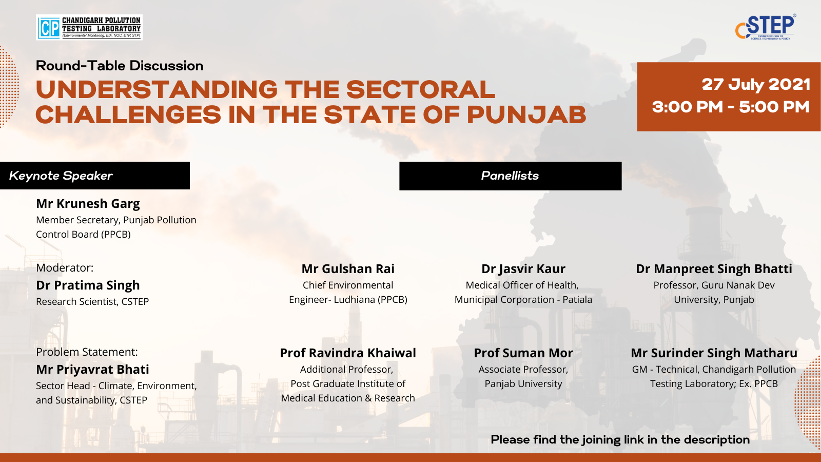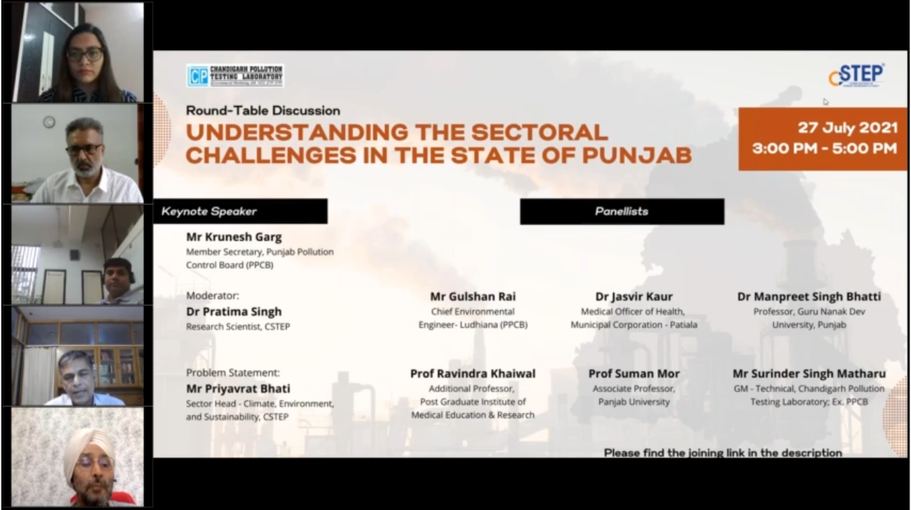 The Center for Study of Science, Technology and Policy (CSTEP) in collaboration with the Chandigarh Pollution Testing Laboratory (CPTL) organised a virtual round-table disussion titled ‘Understanding the Sectoral Challenges in the State of Punjab’ on 27 July 2021.